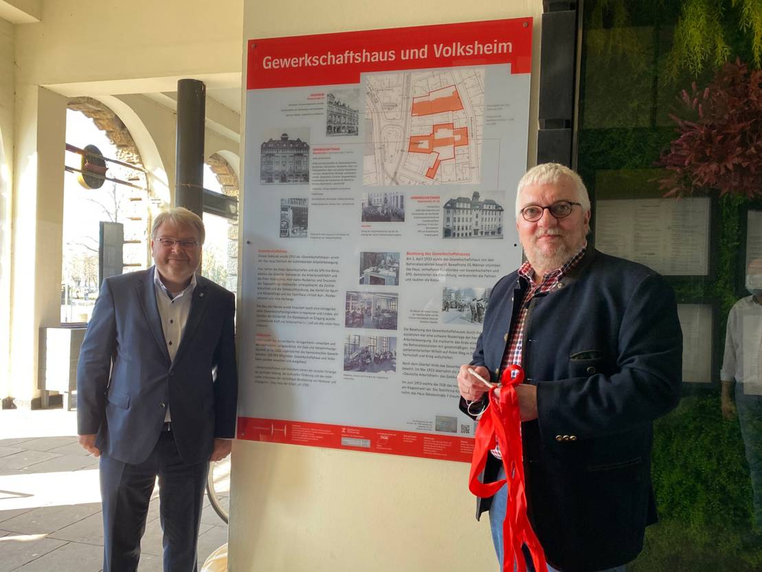 Bürgermeister Thomas Hermann als Vertreter der Landeshauptstadt und der frühere DGB-Vorsitzende Werner Preissner enthüllten eine Informationstafel des ZeitZentrums Zivilcourage / der Städtische Erinnerungskultur. Mit kurzen Texten von Dr. Peter Schulze und anschaulichen Fotografien erinnert sie an die alte Zentrale der Arbeiterbewegung in Hannover.