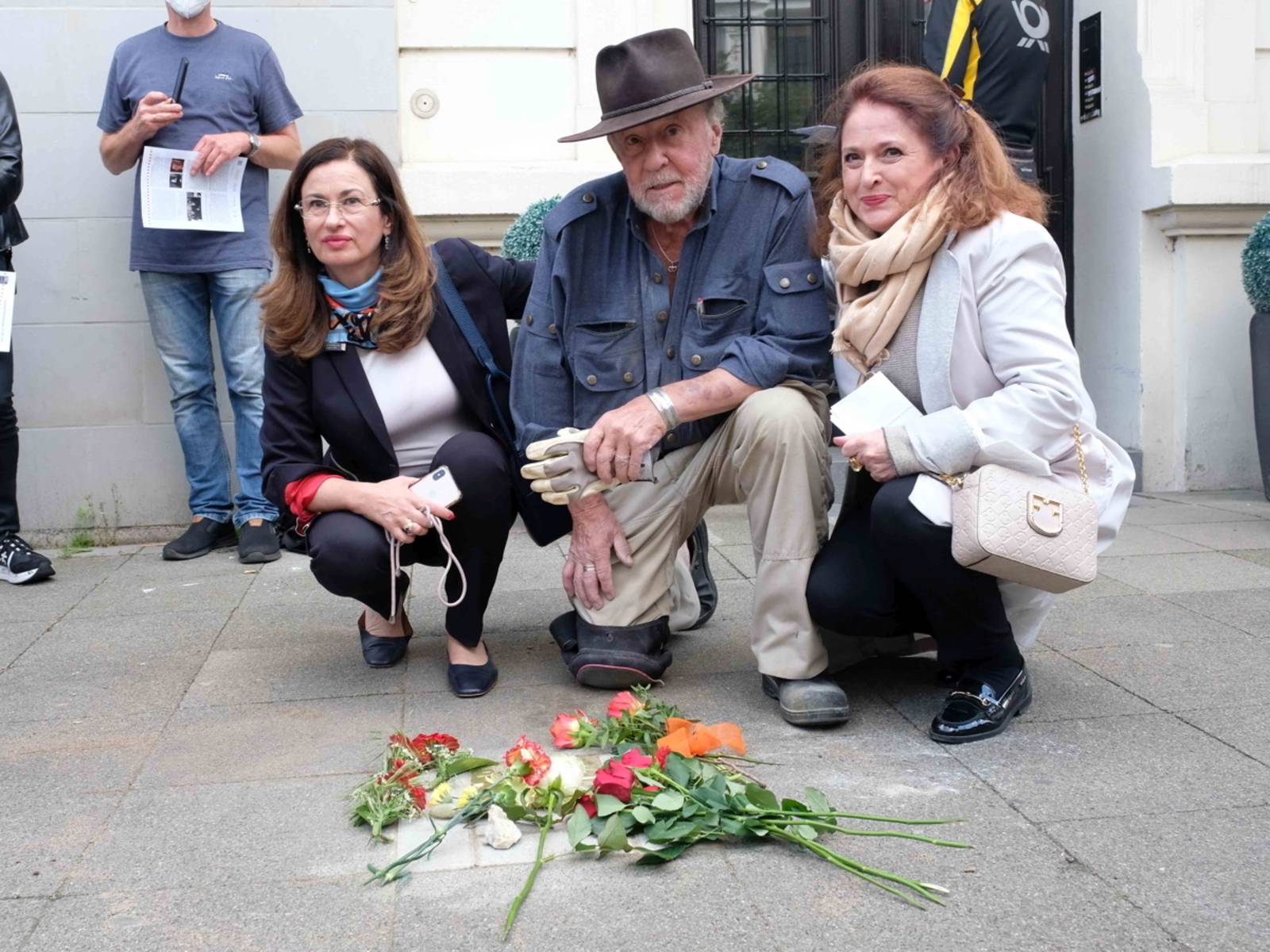 Stolpersteinverlegung in der Bödekerstr. 100: Künstler Gunter Demnig mit Angehörigen an den verlegten Stolpersteinen
