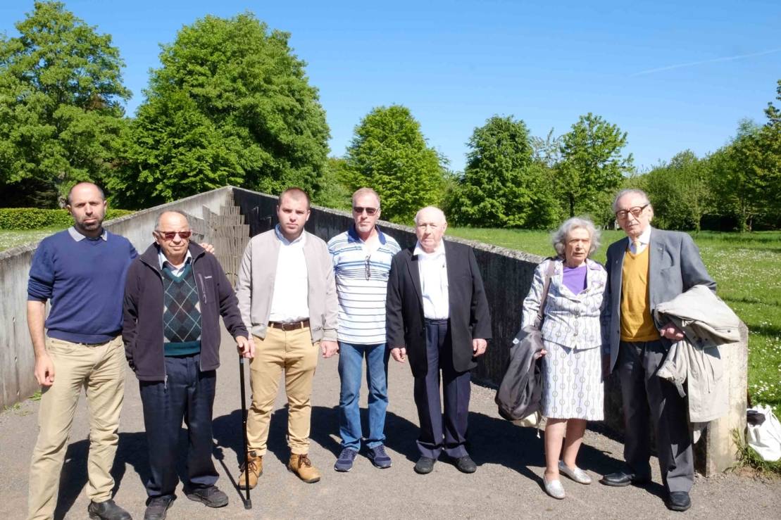 Die ehemaligen Häftlinge Chaim Liss, Nachum Rotenberg und Ivan Moscovich in Begleitung von Angehörigen am Mahnmal für das KZ Ahlem, 2018