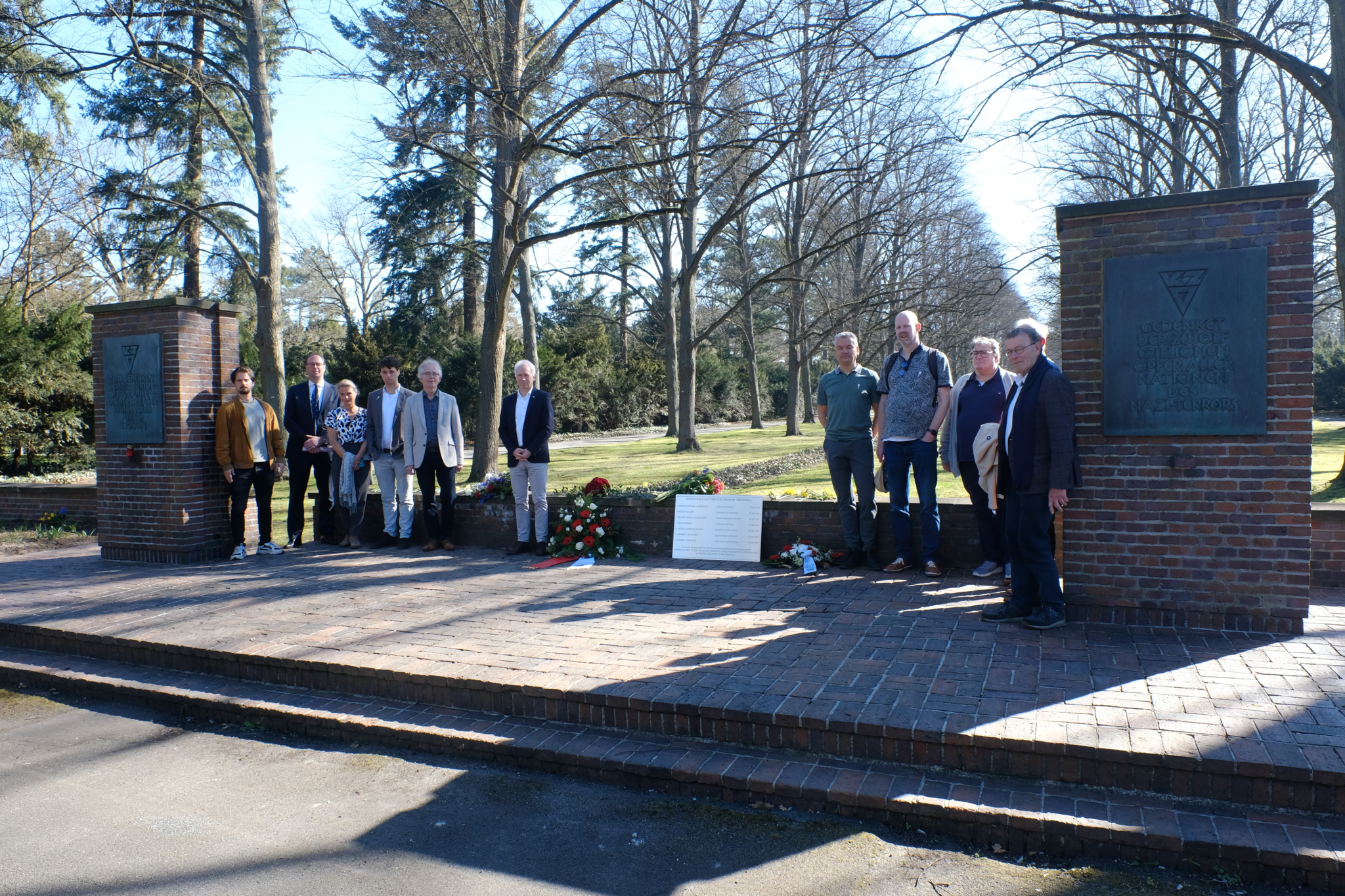 Im Dezember 1945 wurden die Toten exhumiert und auf dem Stadtfriedhof Seelhorst in der Mittelachse beigesetzt. Hier befindet sich auch das zentrale Mahnmal für die Opfer der hannoverschen Konzentrationslager, das 1947 vom Ausschuss ehemaliger KZ-Häftlinge errichtet wurde. Die Angehörigen legten Blumen nieder und stellten eine Gedenktafel mit den Namen der ermordeten Familienmitglieder neben die bereits vorhandenen Gedenkplatten. Im Anschluss fand ein gemeinsamer Besuch der Gedenktafel am Mühlenberger Markt statt. Das ehemalige Lagergelände ist heute überbaut, doch im vergangenen Jahr wurde die Errichtung einer größeren Informationstafel zur Geschichte des KZ Mühlenberg beschlossen. Ein wichtiger Schritt, um den ehemaligen Häftlingen, die für die Hanomag Zwangsarbeit leisten mussten, dauerhaft zu gedenken.