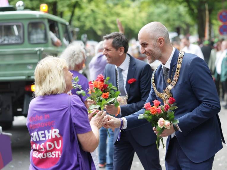 Verteilten Blumen an die Damen: Oberbürgermeister Belit Onay und Ministerpräsident Olaf Lies.