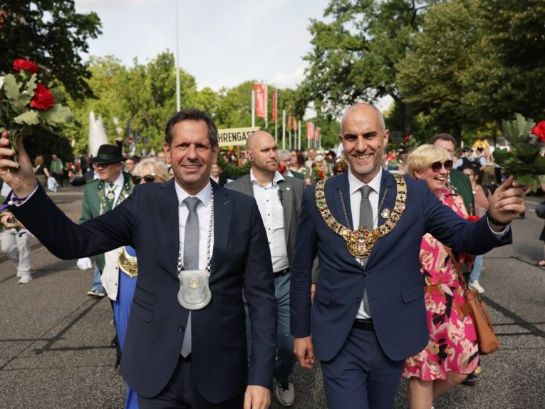 Oberbürgermeister Belit Onay und Schützenpräsident Paul-Eric Stolle in der Bruchmeisterallee, wo sich weitere Tribünen befinden.