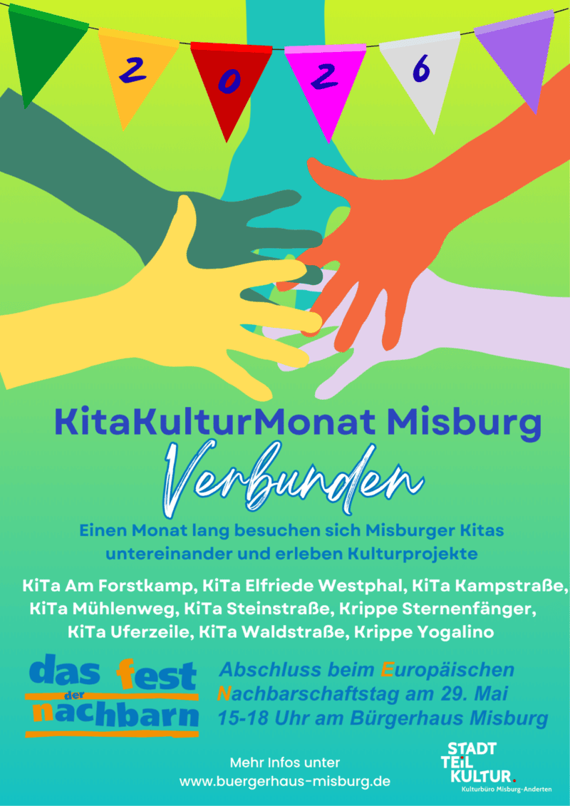 Das Abschlussfest des KitaKulturMonats wird im Rahmen des Europäischen Nachbarschaftstags am 29. Mai 2026 am Bürgerhaus Misburg gefeiert. Von 15 bis 18 Uhr kommen lokale Institutionen und Vereine zusammen und laden große und kleine Nachbarn ein: Es gibt Ponyreiten mit dem Heim für Tiere, Entenfangen mit dem Sozialverband VdK, Bastelaktionen vom Palettengarten und der Tagesstätte Resonanz, eine Kletterwand von der Polizei, Torwandschießen, Spiele, weitere Aktionen zum Mitmachen, Infostände, Waffeln, Kaffee & Kuchen und Spaß!