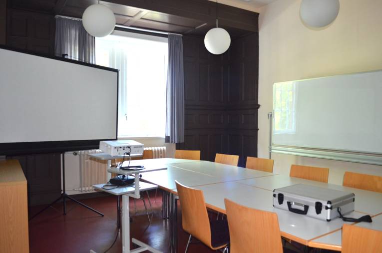 Seminarraum 19 mit Beamer und Moderationskoffer.