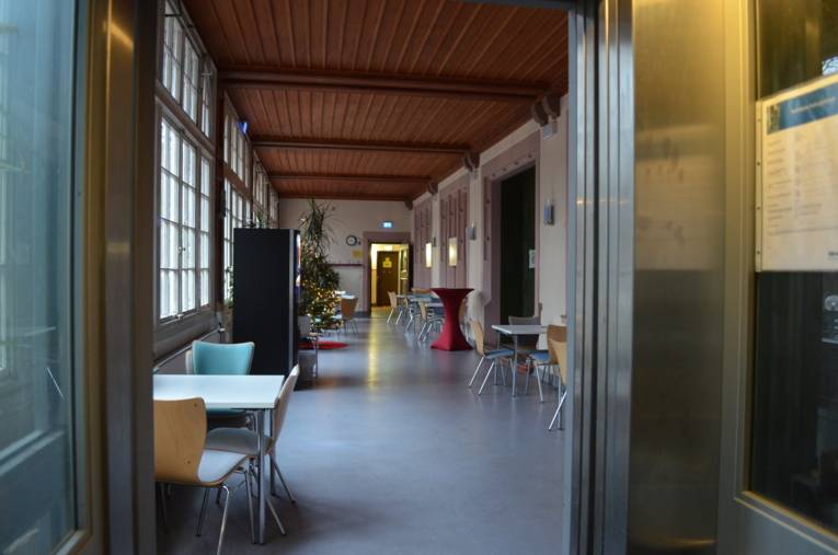 Im Erdgeschoss erreicht der Aufzug das Foyer, von welchem aus die Teestube, Raum 13 und 16, sowie der Saal barrierearm erreichbar sind.