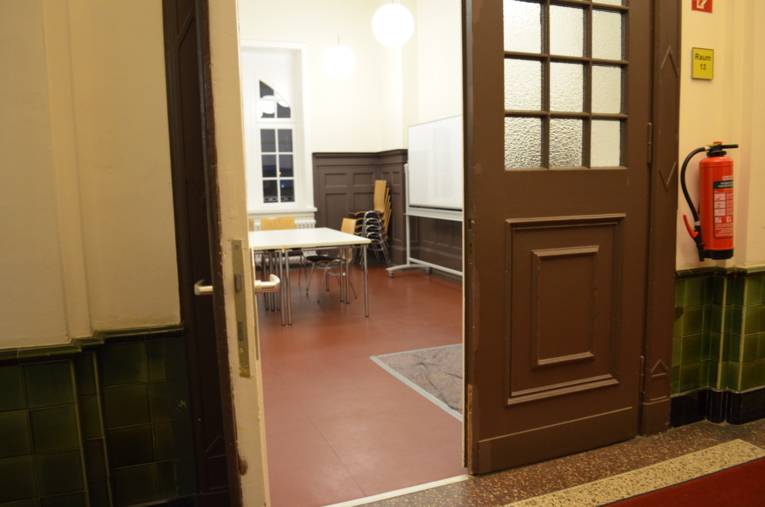 Der Saal ist über drei Türen im Flur barrierearm erreichbar. Die Türschwelle in den Saal ist etwa 1,5cm hoch und aus dem Saal heraus etwa 2cm.