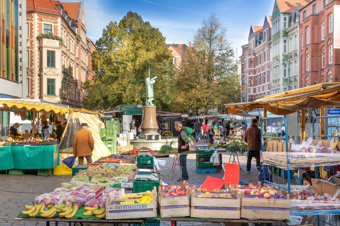 Wochenmarkt auf dem Lindener Marktplatz an einem Samstag.