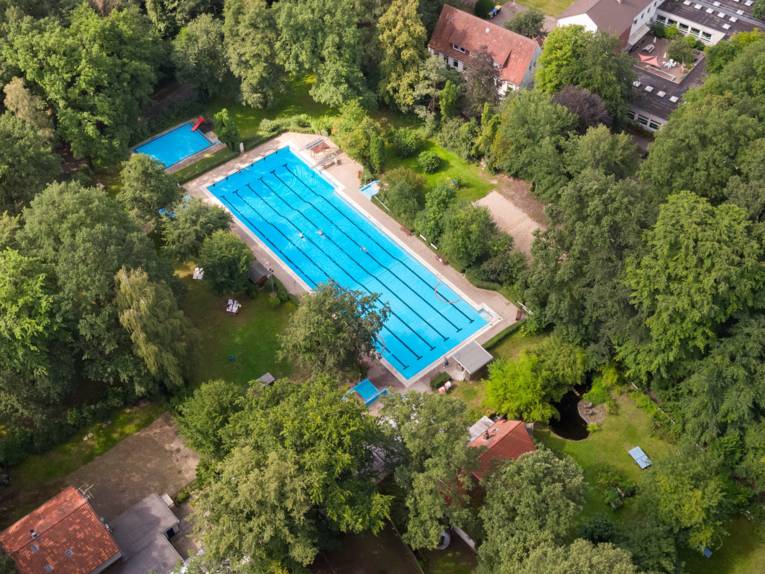 Schwimmer: 50×16,5 Meter mit 3-Meter-Brett, 1-Meter-Brett und abgetrenntem 15×16,5 Meter großem Nichtschwimmerbereich; Planschbecken, 15 Quadratmeter mit Rutsche; Temperatur: 23°C; Spielmatten können geliehen werden
