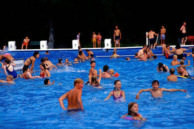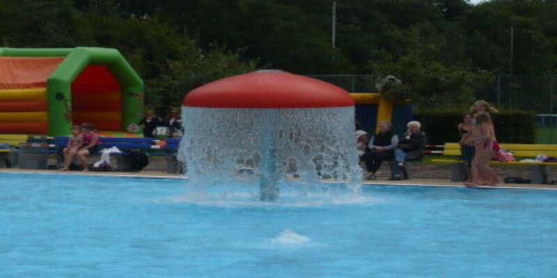 Schwimmer/Nichtschwimmer: 50×30 Meter mit 1-Meter-Sprungbrett, 3-Meter Turm in abgeteilter Sprunggrube, Wasserrutsche; Sonnendeck, Wasserpilz, Bodensprudler; Planschbecken 12x12 Meter; Temperatur: 19–24°C, unbeheizt; ; Wasserschlangen und weitere Wasserspielgeräte sind beim Bademeister erhältlich.