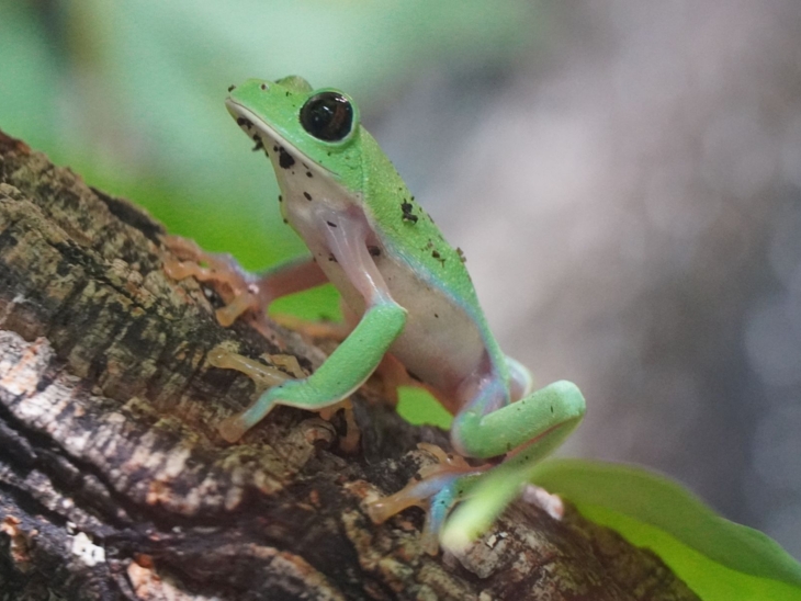 Der Neuzugang im Amphibium ist leuchtend grün, hat blaue Streifen an Beinen und Füßen und orangene Augen: Der Orangeaugen-Laubfrosch (Agalychnis annae) ist ein echter Hingucker. In der Artenwand des Amphibiums lässt sich der Lurch aus Costa Rica bestens beobachten – wenn man ihn erst gefunden hat. Zur Tarnung faltet sich der Frosch gerne zusammen und sieht dann aus wie ein grüner Stein. „Der Orangeaugen-Laubfrosch ist durch Lebensraumverlust und einen tödlichen Hautpilz bedroht, der nur Amphibien befällt“, erklärte Zoo-Geschäftsführer Casdorff, „der Erlebnis-Zoo will durch Zucht und Forschung dazu beitragen, diesen außergewöhnlichen Laubfrosch zu erhalten.“
