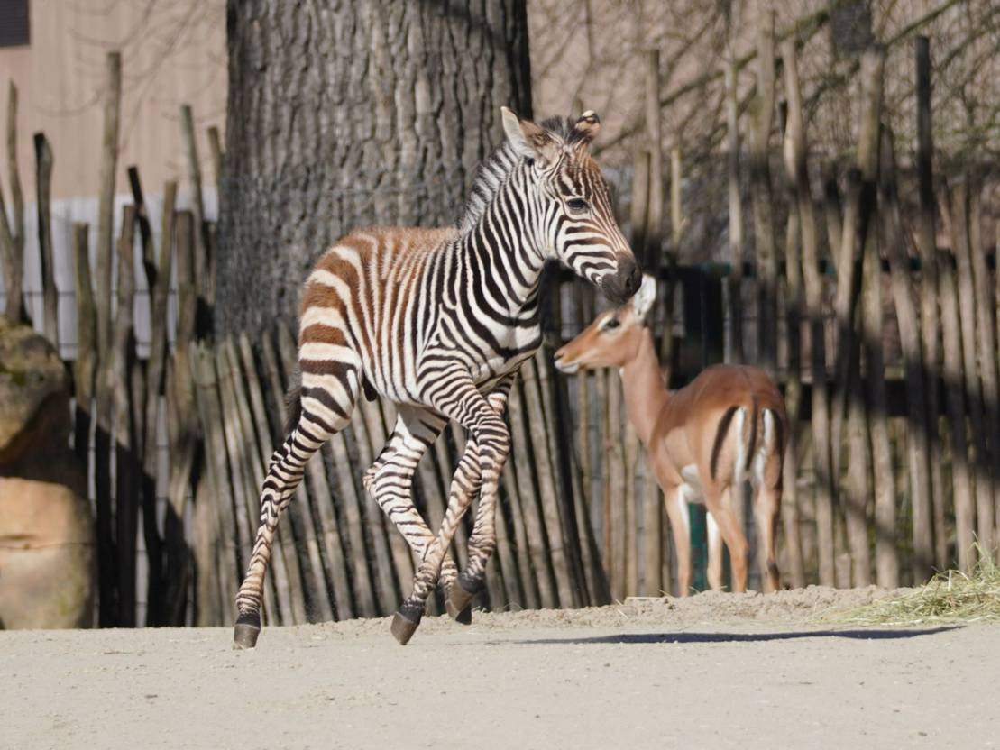Am 9. März brachte Zebrastute Lucia (8) ihren Sohn zur Welt, der sich schnell nach der Geburt als überaus unternehmenslustig erwies. Der Kleine war so kräftig und fest auf den Minihufen, dass die Tierpfleger entschlossen, Mutter und Sohn auf die Steppe und damit an die momentan herrlichst scheinende Sonne zu bringen. Mutter Lucia passt dabei bestens auf ihren Nachwuchs auf. „Der Kleine klebt an seiner Mutter wie eine Briefmarke“, schmunzelt Tierpfleger Philipp Plate.