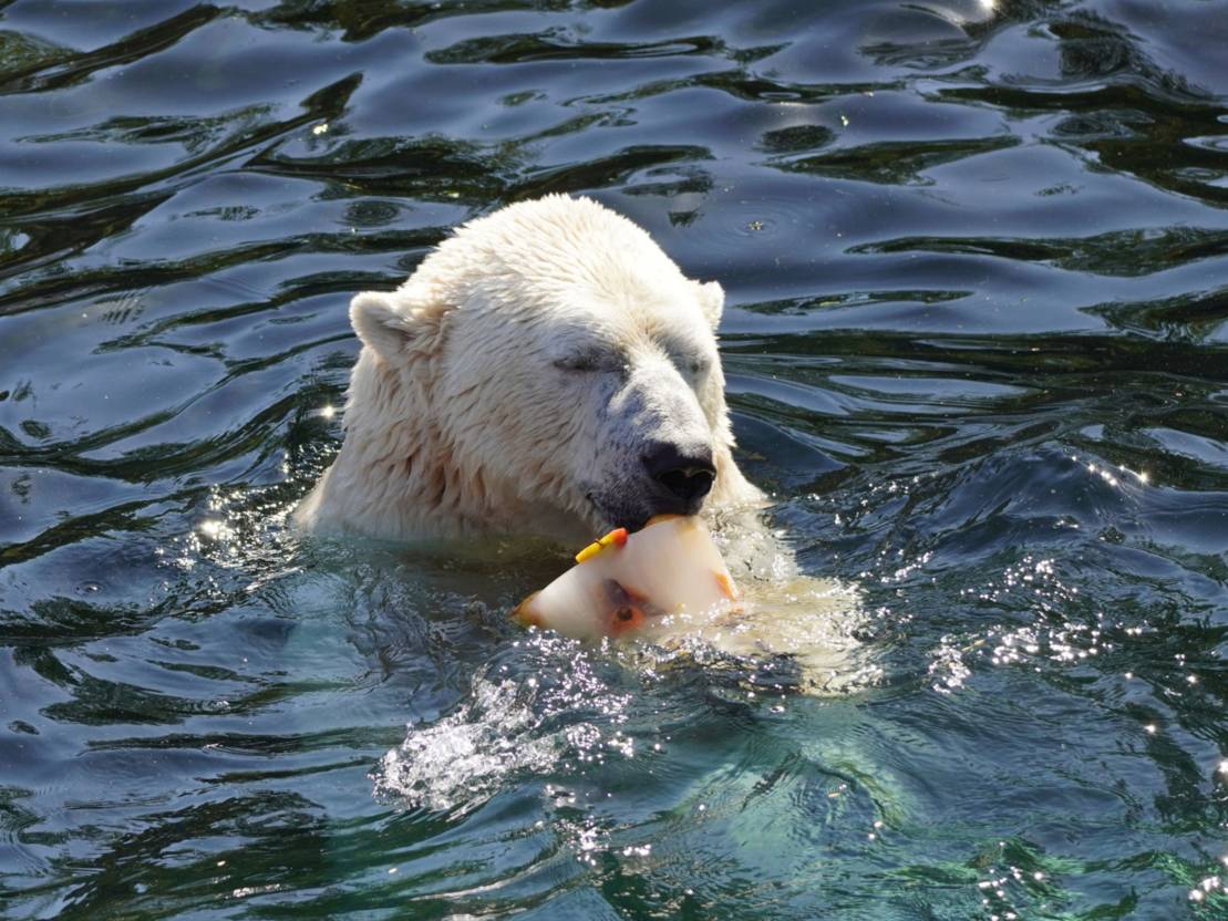 Wenn es um Eistorten geht, kennen die Tierpfleger aus der kanadischen Themenwelt bei der Kreation der eiskalten Leckereien keine Grenzen: Apfel mit Melone und Lebertran, Möhre mit Gurke, Birne und einem Klecks Honig und Joghurt. Oder auch mal ganz klassisch mit allerlei Fisch. Für die Eisbären sind die hausgemachten Eistorten immer ein willkommener Snack und eine tolle Abkühlung an warmen Tagen.