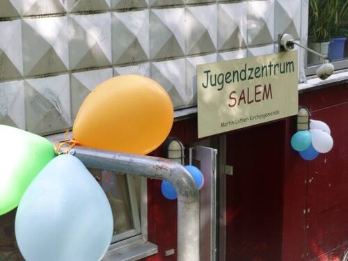 Eingang des Jugendzentrums Salem mit Luftballons.