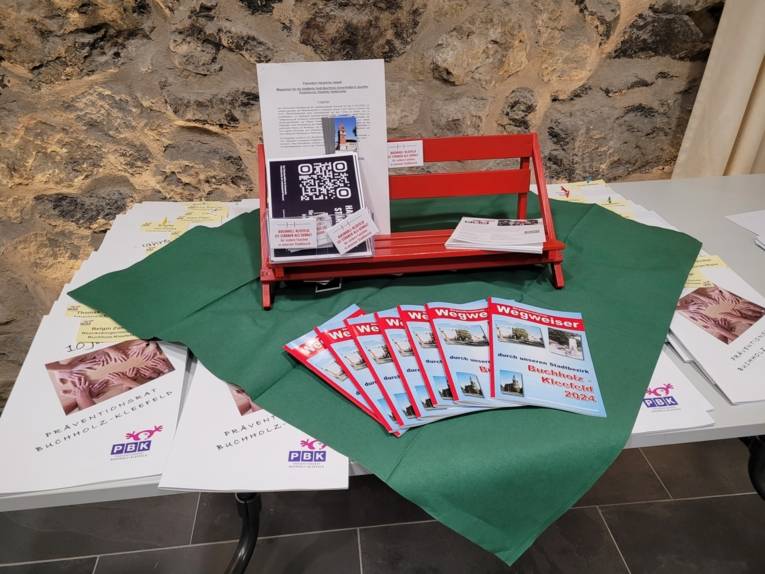 Tisch mit kleiner roter Bank und Flyern