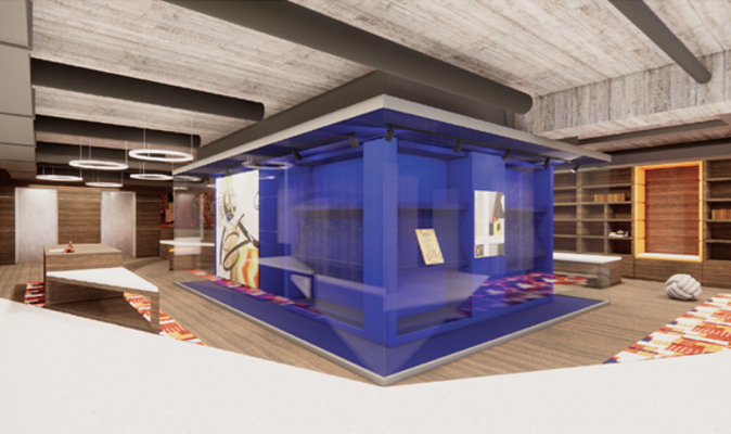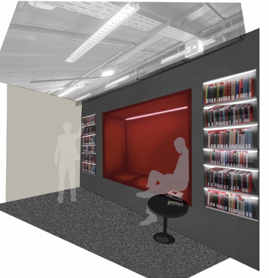 Der Studiengang Innenarchitektur der Hochschule Hannover wurde von der Stadtbibliothek Hannover gebeten, Ideen für diese Umgestaltung zu finden. Zwölf Studierende unter Leitung von Professorin Suzanne Koechert bearbeiteten das Thema am Beginn des Wintersemesters 2023/24: Aufgabe war es, eine architektonische Idee für den Raum zu entwickeln mit Sitzmöglichkeiten und Bücherregalen. Als besondere Herausforderung musste eine Haltung zum Gebäude und den vorhandenen Vitrineneinbauten gefunden werden.
