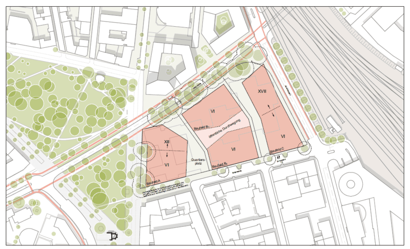 Daraus abgeleitet wurden insgesamt drei unterschiedliche Baufelder, die der Abbildung unten zu entnehmen sind. Die Wohnnutzung soll sich dabei auf den inneren Bereich des Plangebietes beschränken (Baufeld B). Auf der östlichen Fläche (Baufeld C) wird ein Hotel entstehen, ergänzt um Büroflächen und eine Kita. In den zu den Verkehrsflächen orientierten Erdgeschosszonen aller Baufelder sollen verschiedene Handels- und Dienstleistungs- sowie Gastronomiebetriebe einziehen.
