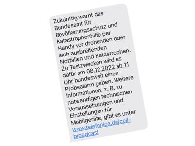 Der erste Test lief am bundesweiten Warntag (8. Dezember 2022) ab 11 Uhr. Ende Februar 2023 war der offizielle Starttermin für Cell Broadcast in Deutschland