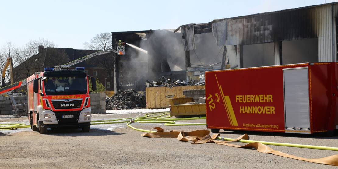 Die Löschmaßnahmen beim Brand in einem Entsorgungsbetrieb in Misburg-Süd dauern weiterhin an. Da für die Lagerhalle Einsturzgefahr besteht, ist es den hannoverschen Brandschützern nicht möglich, in die Halle vorzudringen. Vor Ort kommen Greifbagger des Entsorgungsbetriebes zum Einsatz, die erst nach dem teilweisen Einreißen von Seitenwänden die rund 500 Tonnen Kunststoffmaterial erreichen. Das endgültige Ablöschen des Brandgutes erfolgt mit Strahlrohren im Außenbereich der Halle.