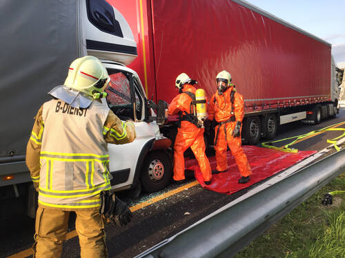 Gegen 18:00 Uhr war der 23-jährige Fahrer eines Peugeot-Kleinlasters in Höhe des Parkplatzes Vahrenheide in Fahrtrichtung Berlin auf einen vor ihm befindlichen LKW-Volvo aufgefahren. Durch die Wucht des Aufpralls wurde das Führerhaus des Kleinlasters so stark beschädigt, dass der Fahrer von der Frontpartie seines Fahrzeugs eingeklemmt wurde. Er konnte sein Fahrzeug jedoch vor Eintreffen der Feuerwehr und des Rettungsdienstes selbstständig verlassen. Am Verkehrsunfall war ein weiterer Renault-Kleinlaster beteiligt.