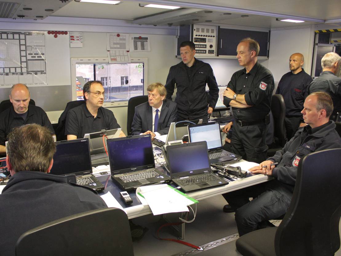 Feuerwehrdezernent Harald Härke in der Leitstelle auf dem Schulhof der Bismarckschule