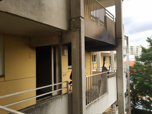 Durch die durchgebrannte Eingangstür schlugen die Flammen in den Laubengang und drohten auf das darüberleigenden Geschoss überzugreifen.