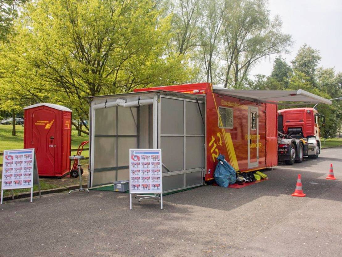 Er kann bei Brand- und Hilfeleistungseinsätzen mit mehreren kontaminierten Einsatzkräften die Voraussetzungen zur Grobreinigung sowie Umkleidemöglichkeiten bereitstellen.