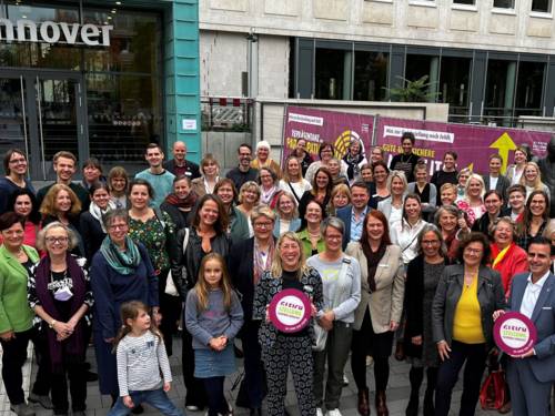 Das Regionshaus leuchtet, um ein Zeichen gegen Gewalt an Mädchen und Frauen zu setzen.