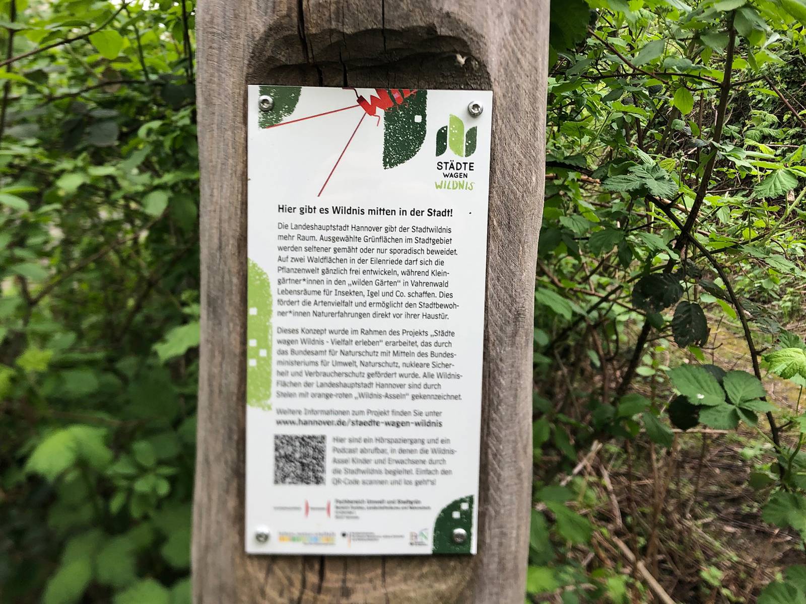 Ein Eintauchen in die „Stadtwildnis zum Hören“ bietet seit 2021 der Hörspaziergang "Asselquasselwildniswalk" mit Informationen zur wilden Fauna und Flora an sechs Stationen auf dem Lindener Berg. Nun stehen weitere drei Podcasts zur Verfügung, die die Wildnis in den Stadtwäldern, in Hannovers Kleingärten und auf weiteren Flächen akustisch vermitteln. Alle "Asselquasselwildniswalks" lassen sich auf das Smartphone laden. Besucher*innen vor Ort finden den Zugang außerdem über einen QR-Code, der auf Informationsschildern an hölzernen Wildnisstelen an den Flächen angebracht ist.