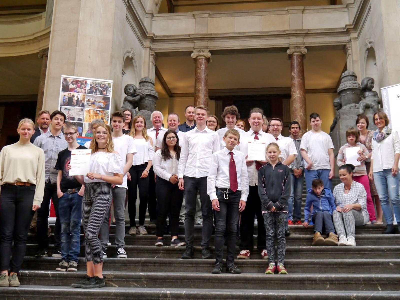 Die Urkunden wurden gemeinsam von der Niedersächsischen Landesschulbehörde und der Landeshauptstadt Hannover an die Schülerinnen und Schüler sowie Lehrkräfte und Schulleitungen überreicht. Als Vertreterinnen und Vertreter der Landesschulbehörde waren Ulrike Rehn, Fachdezernentin Berufsorientierung, Carsten Schröder, Landesfachkoordinator für Nachhaltige Schülerfirmen, und Ocke Dethlefsen, Regionalkoordinator für nachhaltige Schülerfirmen und Schülergenossenschaften, vor Ort. Seitens der Landeshauptstadt Hannover nahmen Susanne Wildermann, Leiterin des Agenda 21- und Nachhaltigkeitsbüros, und Udo Büsing, der die nachhaltigen Schülerfirmen im Rahmen der Bildungsarbeit betreut, teil.