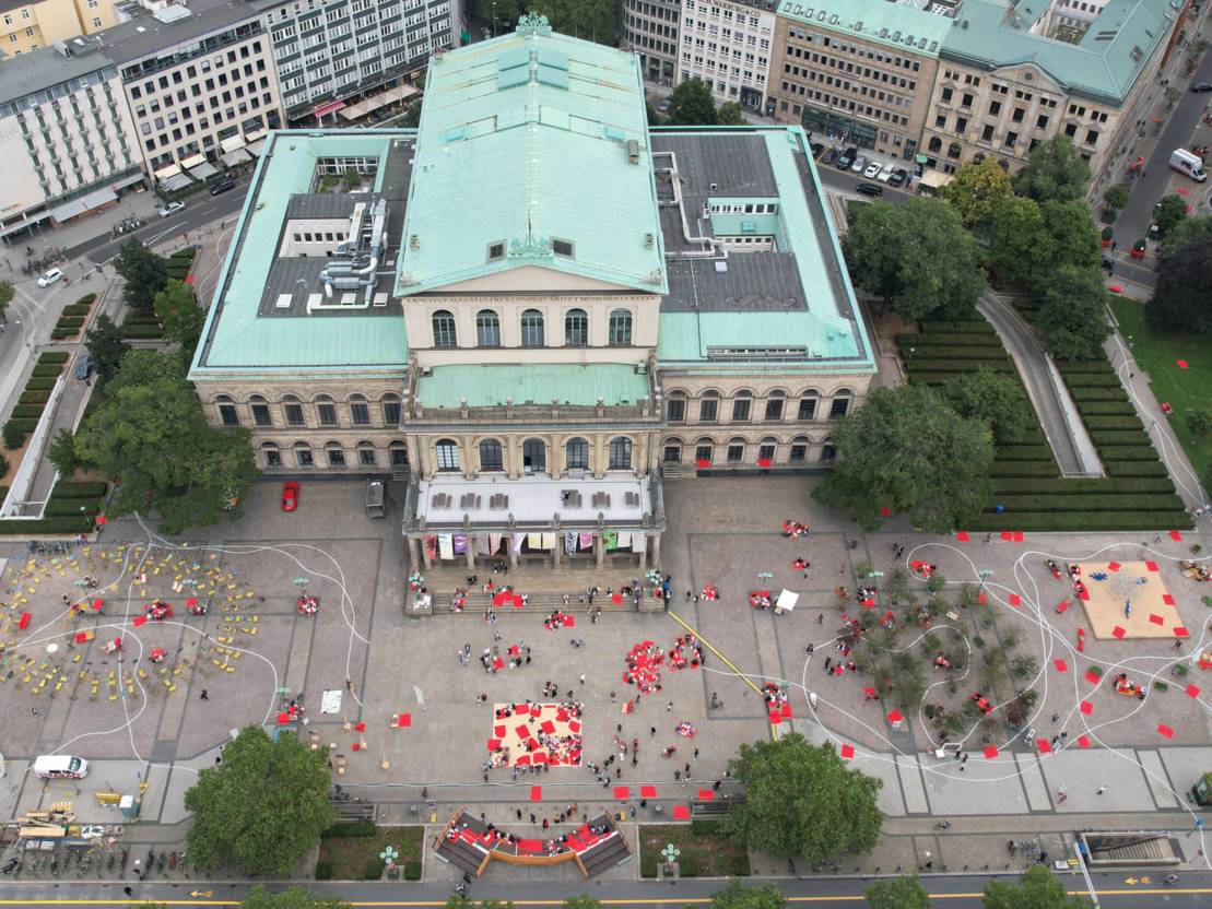 Nach der öffentlichen Präsentation und einer technischen Vor-Ort-Begehung geht es rund sechs Wochen später im nächsten Schritt für alle Projektideen um eine konkrete und öffentliche Umsetzung im Hof zwischen Schauspiel und Künstlerhaus, die im Interesse der Sichtbarkeit gebündelt an einem gemeinsamen Termin stattfindet.