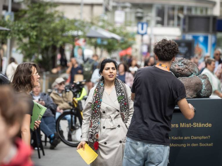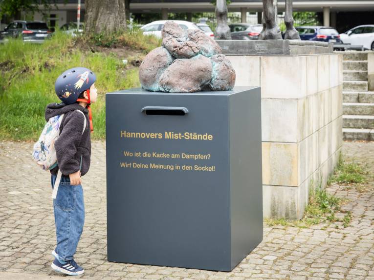 In Hannover, wo sie als Fremde am Hauptbahnhof ankommt, entdeckt sie zunächst das Ernst-August-Reiterdenkmal auf dem Bahnhofsvorplatz. Dieses inspiriert sie zu einer Skulptur, die sich zugleich einfügt und provoziert, und so lädt Farzane Vaziritabar ein, individuell empfundene „Mist-Stände“ Hannovers anonym zu formulieren. Am 4. Mai sind die „Mist-Stände“ Hannovers von 10 bis 12.30 Uhr auf dem Ernst-August-Platz sowie von 13 bis 15 Uhr auf dem Platz der Göttinger Sieben und am 6. und 7. Mai jeweils von 10 bis 14 Uhr Gesprächsanlass am Welfengarten, vor der Universität. Die „Mist-Stände“ sammelt und veröffentlicht Vaziritabar auf ihrer Webseite: www.farzane.art.
