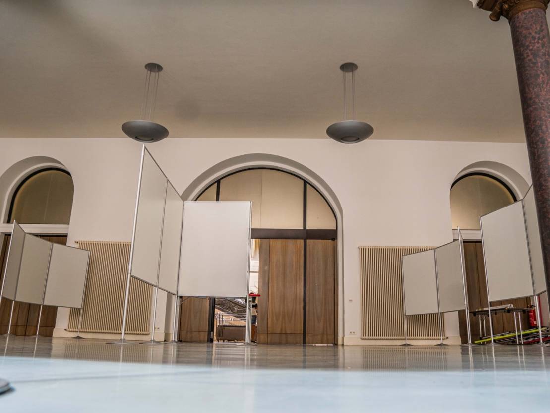 Ursprünglich diente dieser Bereich als Stadtkasse, die jedoch 1956 an die Südseite des Rathauses verlegt wurde. Die prächtige Säulenarchitektur und die detaillierten Kapitelle spiegeln die frühere Nutzung des Raumes wider, der für den Publikumsverkehr ausgelegt war. Historische Fotos zeigen, dass der Raum damals mit Schreibtischen und einem langen Tresen ausgestattet war, hinter dem städtische Mitarbeiter an großen Rechenmaschinen arbeiteten. Nachdem die Stadtkasse umgezogen war, zog die städtische Telefonzentrale in den Raum ein, die durch die Einführung moderner Technik weniger Platz beanspruchte. Schließlich wurde der Raum 1999 in einen Bürgersaal umgewandelt, während das Bürgerbüro heute links davon zu finden ist.