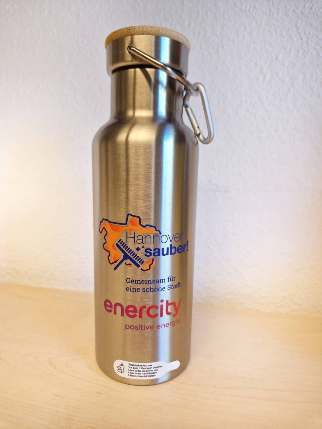Ausgegebene Isolierflasche beim Hitzeaktionstag 2024.