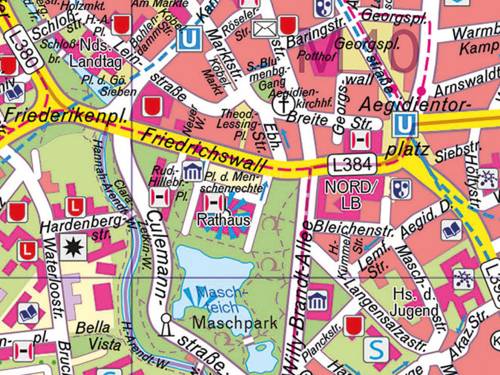 Die übersichtlich gestaltete Umgebungskarte bildet das Gebiet der Region Hannover und des Umlandes mehrfarbig ab. Sie reicht von Schwarmstedt im Norden bi...