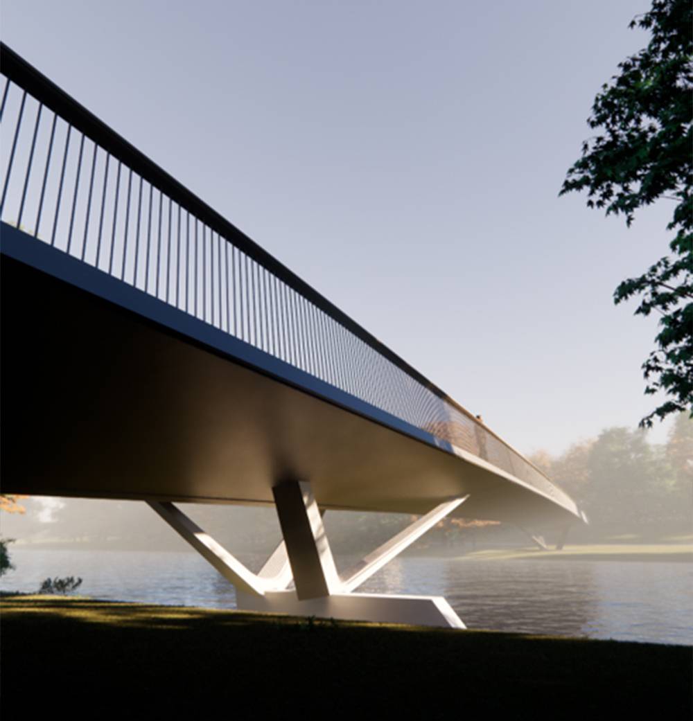 Das Geländer besteht aus Metallstäben (Füllstabgeländer) mit einem Handlauf aus Holz. Lichtelemente unter dem Handlauf und entlang der Sitzbank sorgen für eine sichere und stimmungsvolle Beleuchtung der Brücke bei Nacht. Ebenfalls aus Holz ist der Sitzbelag der langen Bank. Eine attraktive Ansicht bietet die Brücke auch von unten: zwei V-förmige Stützpfeiler auf jeder Seite tragen das Bauwerk.