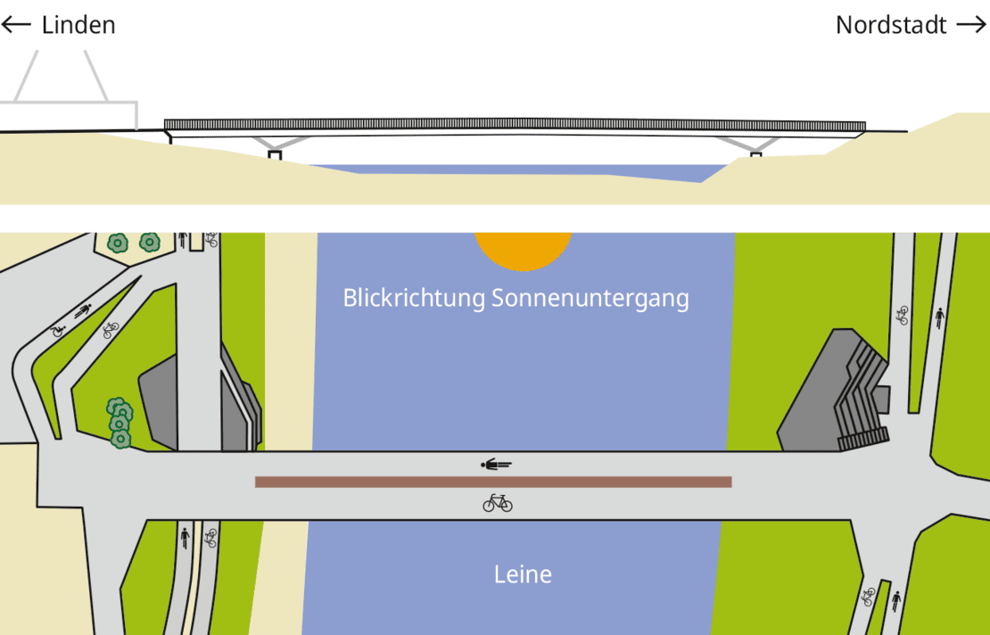 Mit dem Bau der Brücke wertet die Landeshauptstadt Hannover auch das Umfeld auf. Die Zufahrten zur Brücke für den Radverkehr sowie die Zugänge für den Fußverkehr und mobilitätseingeschränkte Personen hat die Verkehrsplanung auf beiden Uferseiten neu sortiert und dabei die Wegeführung unter der Brücke entlang der Ufer einbezogen. Auf beiden Uferseiten bieten Treppenelemente die Möglichkeit zum Aufenthalt mit Blick auf die Leine.