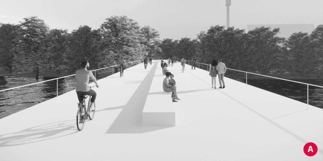 Die Brücke mit nur einem Bogen trennt Geh- und Radweg konstruktiv. So können Radfahrer*innen und Fußgänger*innen besser geführt werden. Vier Meter breit ist der Radweg, fünf Meter stehen als Fußweg und Aufenthaltsfläche zur Verfügung.