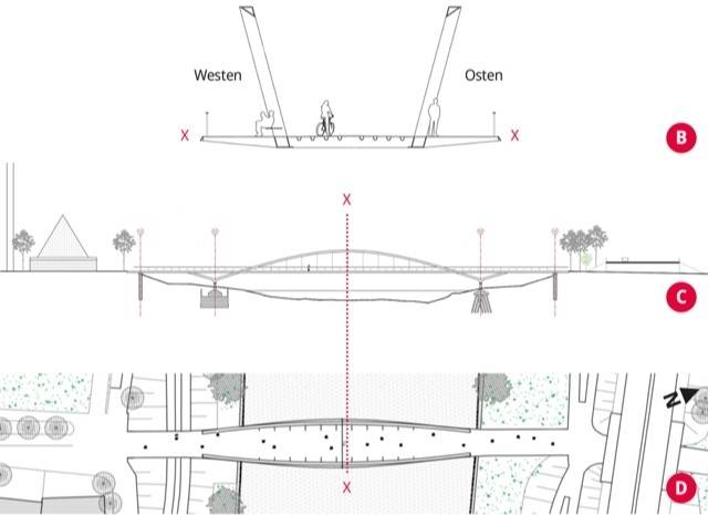 Westseite vorgesehen, so behindert die Konstruktion nicht die Sicht. Zwischen den Blechabhängungen sind Sitzgelegenheiten geplant. Der Radverkehr wird auf der Ostseite geführt. Zusammen mit der interessanten Unterkonstruktion ein sehr dynamischer Entwurf.