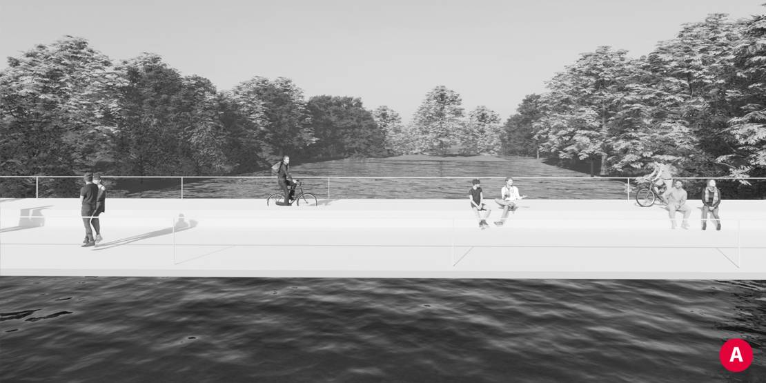Die beiden Bögen sind gegenüber der Vorzugsvariante deutlich in Länge und Höhe reduziert, der Bogen setzt sich unter der Verkehrsfläche fort. Diese ist längs dreigeteilt, in der Mitte fährt der Radverkehr. Die Bögen sind nach außen geneigt und mit flachen Blechen statt mit Rundstahl befestigt. Durch die Aufweitung der Fläche in der Mitte kann man sich zwischen den Streben gut aufhalten, die Bleche wirken wie ein Bilderrahmen. Am Anfang und am Ende der Brücke wird es allerdings für Fußgänger*innen etwas eng, hier könnten Konflikte mit dem Radverkehr entstehen.