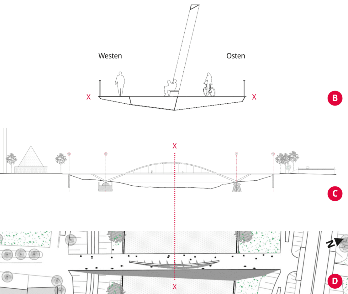 Entwurf 3 – DeckbrückeA – Visualisierungen, B – Querschnitt in Brückenmitte (vergrößert), C – Ansicht,D – Aufsicht