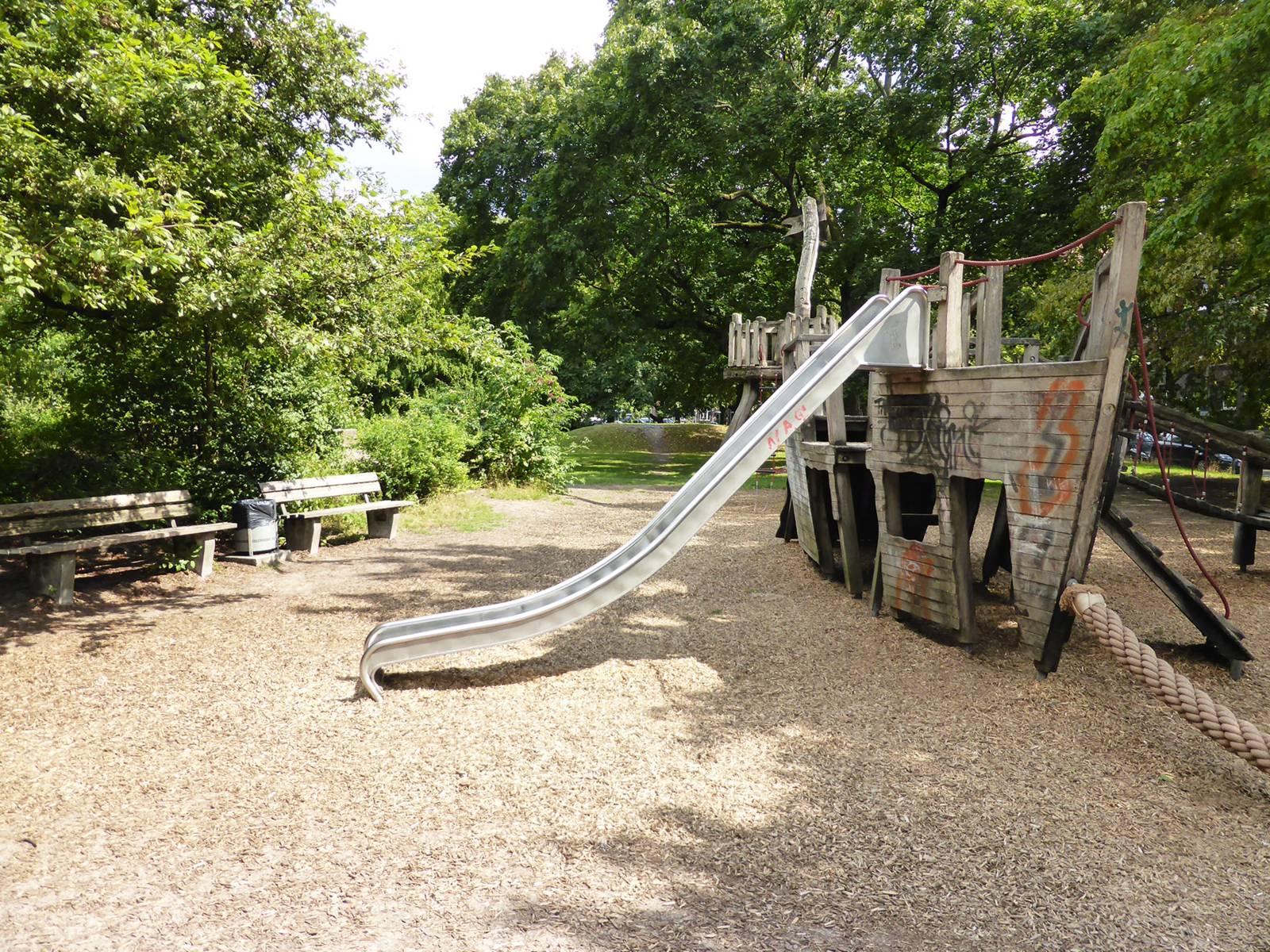 Insbesondere die Spielangebote aus Holz sind zum Teil in die Jahre gekommen und werden ersetzt. Ebenfalls in Planung befindet sich die direkt östlich angrenzende Grünfläche mit ihrem wertvollen Baumbestand, den Belägen aus Klinkerpflaster und verschiedenen gestalteten Beetflächen mit Sitzangeboten. Dieser Bereich ist durch das Wachstum der Baumwurzeln in Teilen der befestigten Flächen beschädigt. Eine Sanierung mit teilweiser Entsiegelung und der Neuordnung der Aufenthaltsbereiche, unter besonderer Berücksichtigung des wertvollen Baumbestandes, ist das Ziel der Erneuerung.