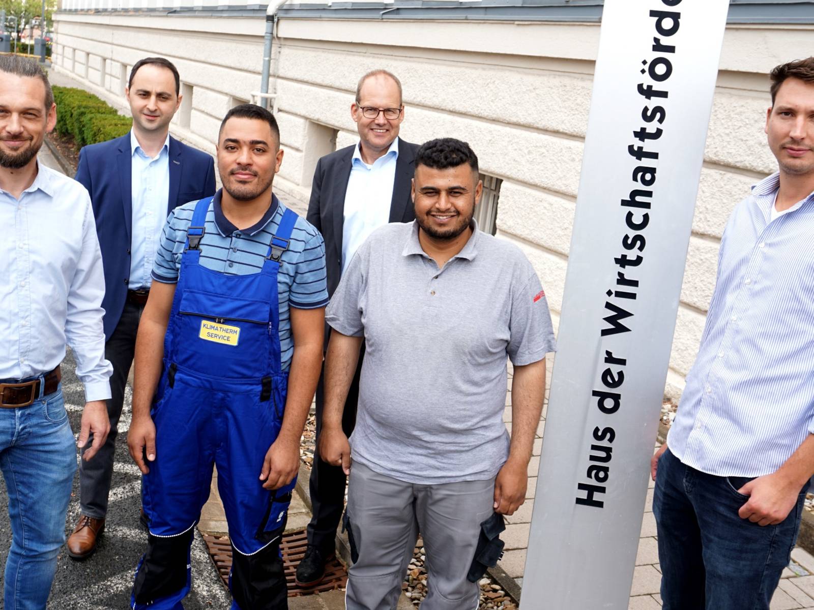 Berichten vom Projekt „Welcome to Hannover Region“: Maik Wehrhahn (v.l.), Geschäftsführer der Klimatherm GmbH & Co. KG, Projektleiter Tornike Murtskhvaladze, Firas Ben Attaya, Projekt-Teilnehmer, Wirtschaftsdezernent Ulf-Birger Franz, Projekt-Teilnehmer Belgacem Slama und Tim Strecker, Geschäftsführer der Elektro Strecker GmbH.