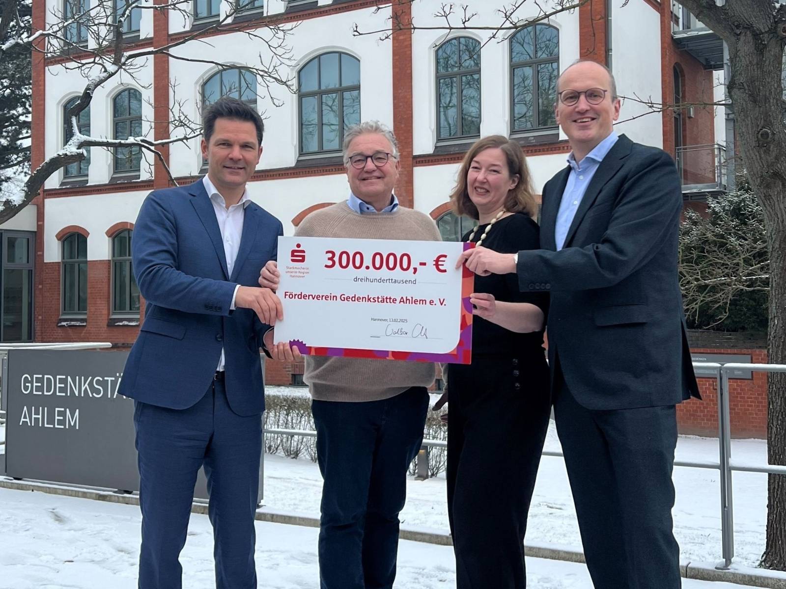 Spende für Ahlem (v. l. n. r.): Regionspräsident Steffen Krach, Hauke Jagau (Vorsitzender des Fördervereins Gedenkstätte Ahlem), Stefanie Burmeister (Leiterin der Gedenkstätte Ahlem) und Volker Alt (Vorstandsvorsitzender der Sparkasse Hannover).