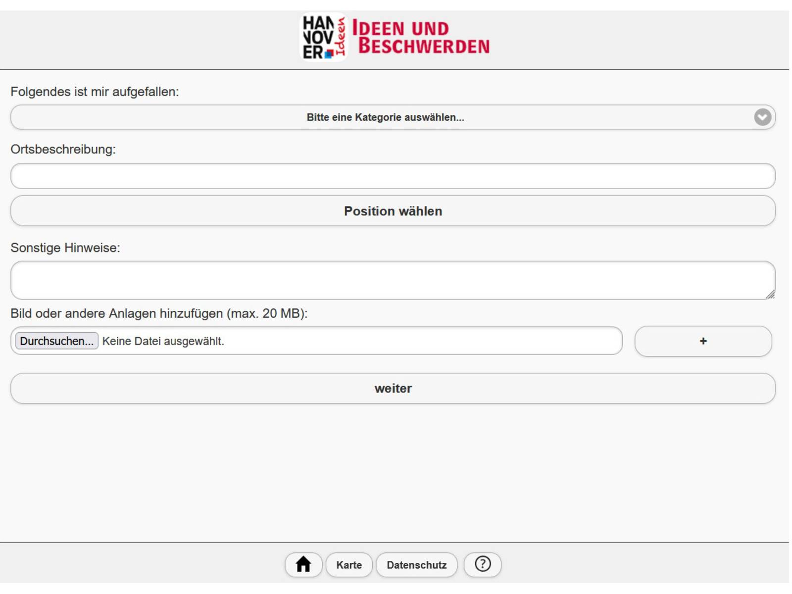 Klicken Sie oben auf der Seite bei Folgendes ist mir aufgefallen auf: Bitte eine Kategorie auswählen.