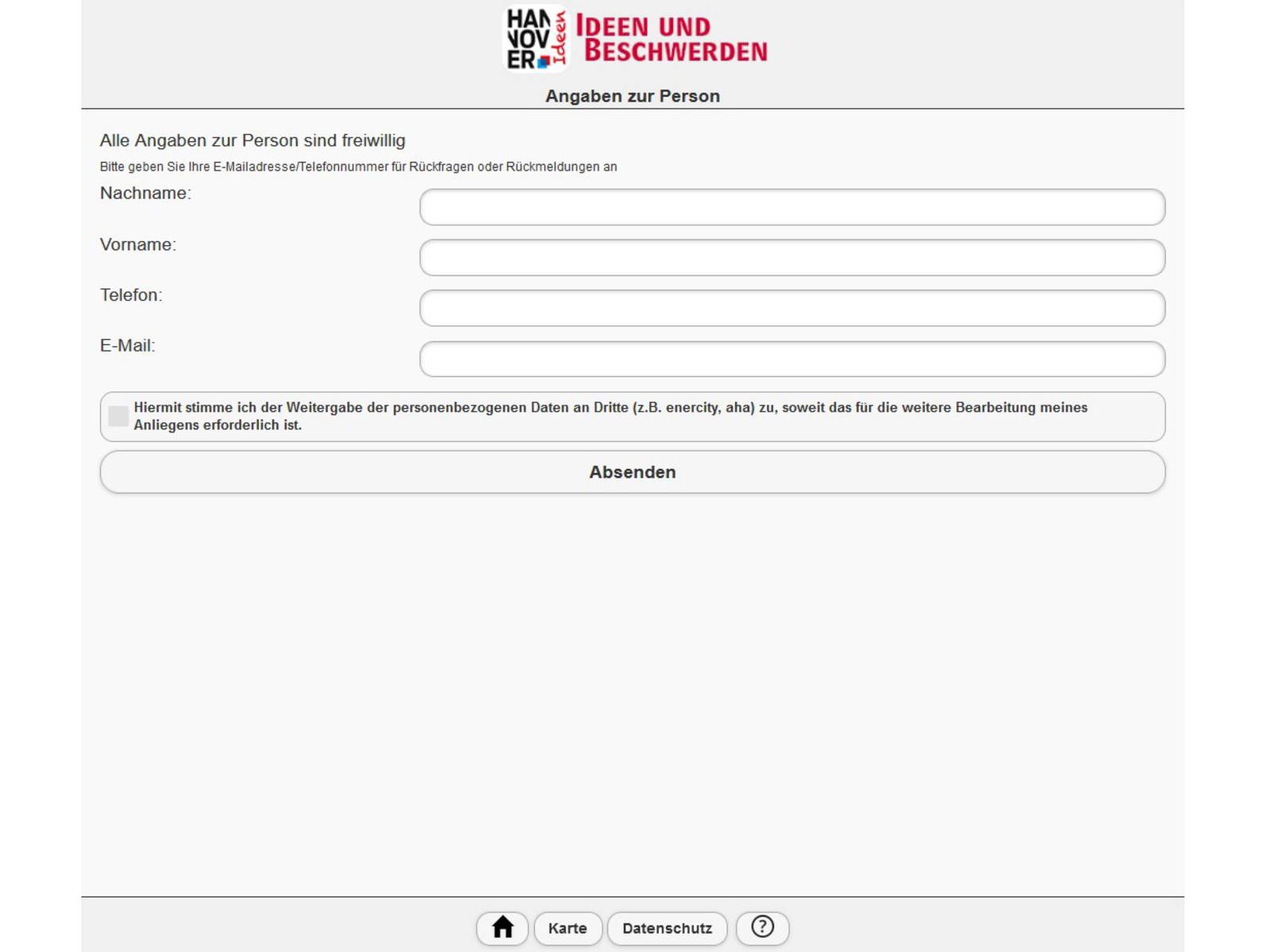Klicken Sie dann links unten den grauen Kasten an: Hiermit stimme ich der Weitergabe der personenbezogenen Daten an Dritte zu, soweit das für die weitere Bearbeitung meines Anliegens erforderlich ist.