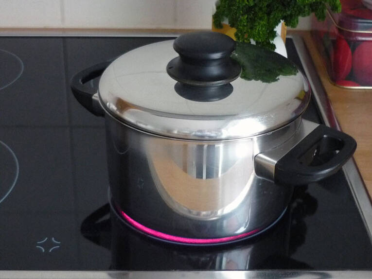 Topf auf Herdplatte © LHH Ein Kochtopf sollte genau auf die Herdplatte passen, um die Energie optimal zu nutzen.