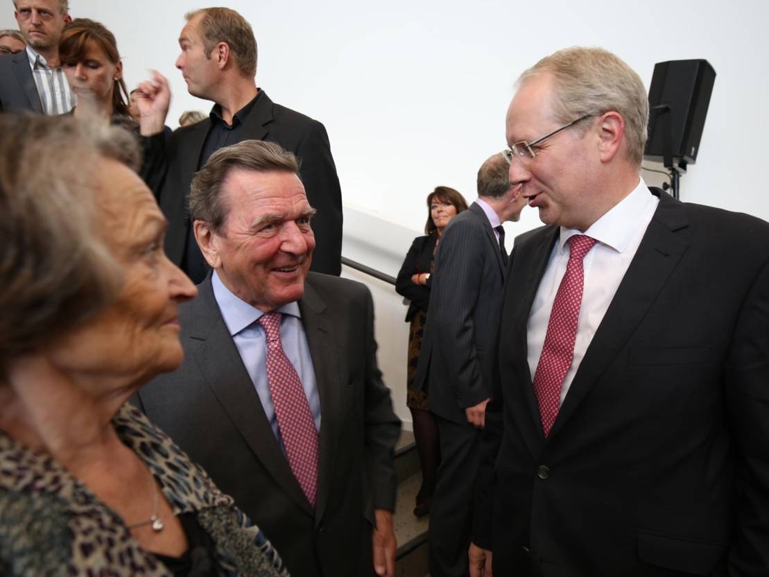OB Schostok und Altkanzler Schröder © LHH (Christian Burkert) Oberbürgermeister Stefan Schostok im Gespräch mit Altbundeskanzler Gerhard Schröder
