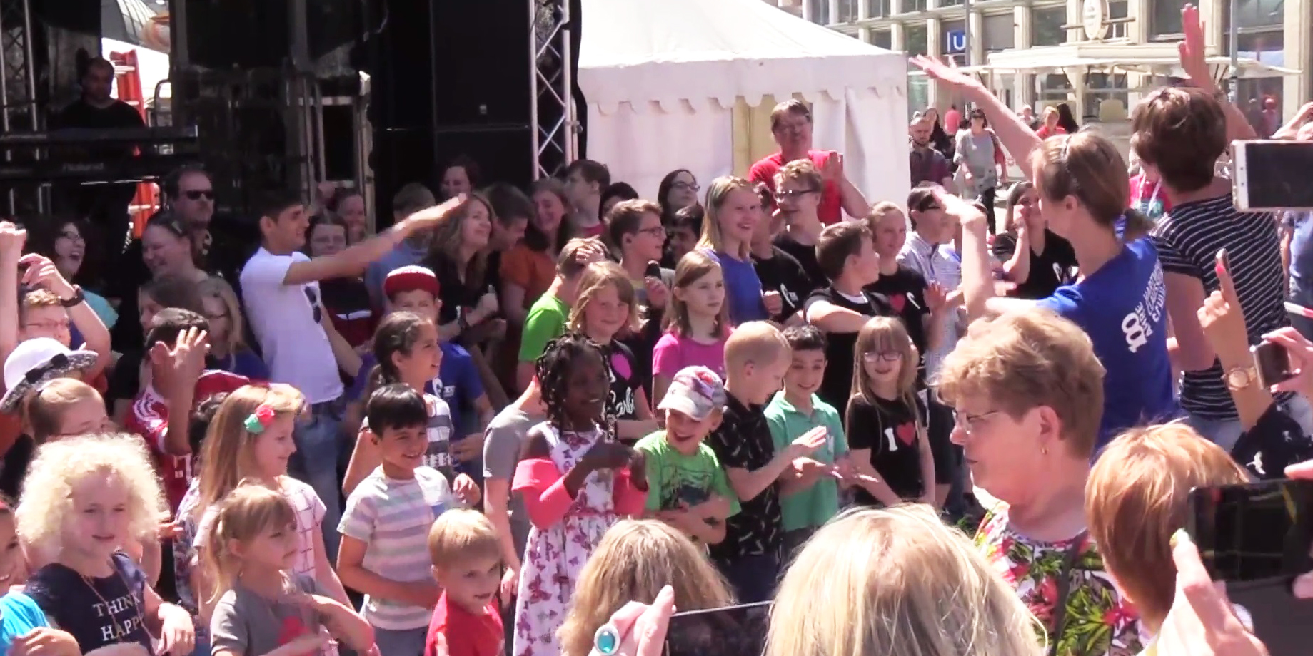 SchülerInnen der Hartwig Clausen Schule mit der Band Blind foundation performen den Inklusionssong in Gebärdensprache.