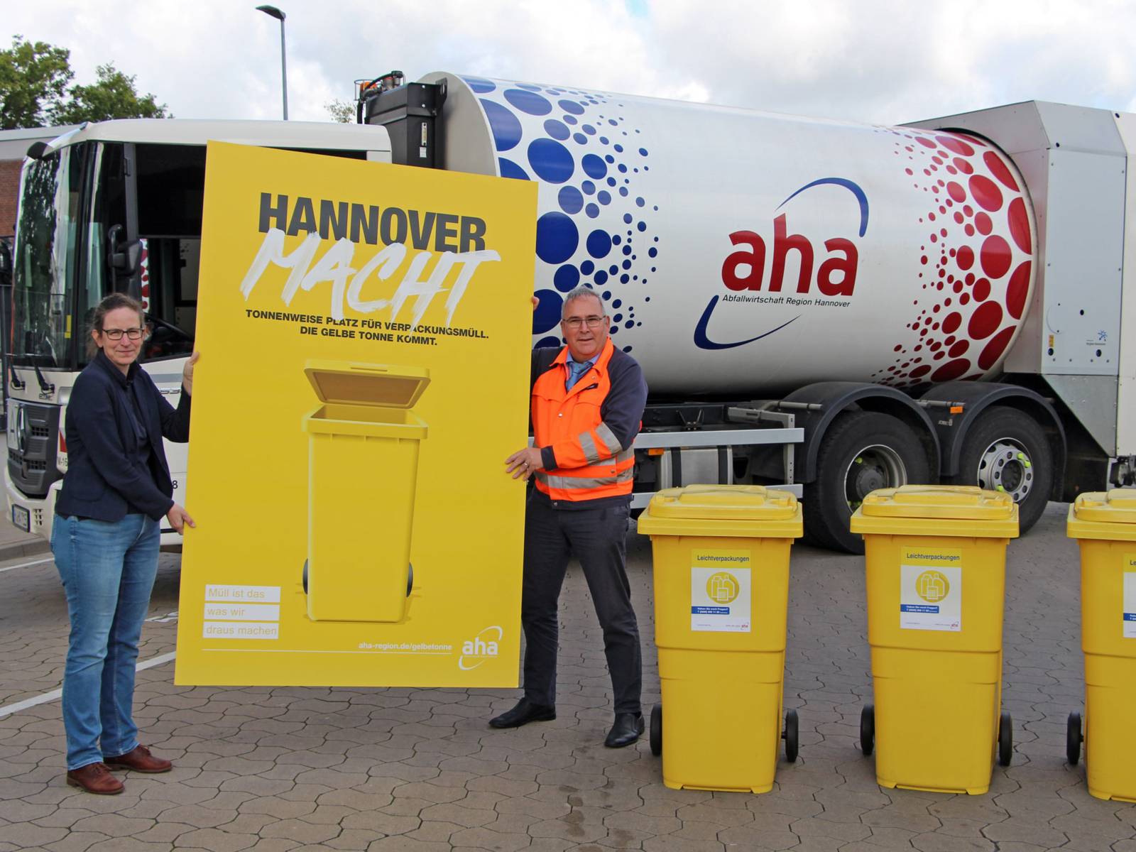 Dunja Veenker, Leiterin der Abfall- und Wertstoffsammlung von aha, und aha-Geschäftsführer Thomas Schwarz präsentieren die neuen Gelben Tonnen.