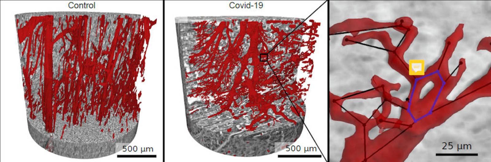 Im Vergleich zum gesunden Herzen zeigte sich hier ein durch Neubildung und Aufspaltung der Gefäße chaotisch umgebautes Netzwerk voller Abspaltungen, Verzweigungen und Schlaufen. Diese Veränderungen sind der erste direkte visuelle Nachweis einer speziellen Form der Gefäßneubildung im Gewebe, der sogenannten intussuszeptiven Angiogene, einer der Haupttreiber der Lungenschädigung bei Covid-19.